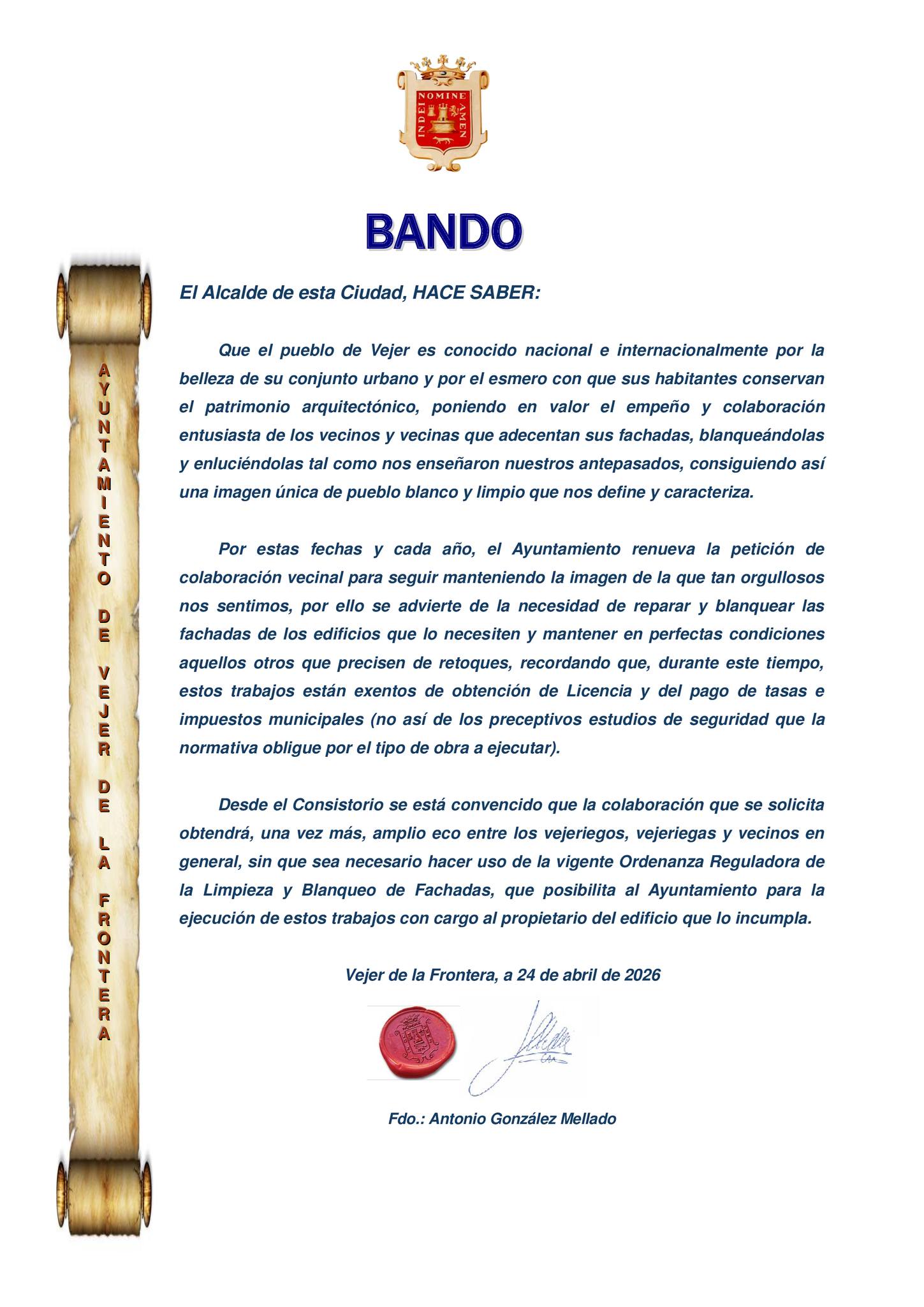 El Ayuntamiento de Vejer a través de un bando de Alcaldía invita a los vecinos del la localidad al blanqueamiento y buen estado de las fachadas de sus casas en honor al reconocimiento, que obtuvo en el año 1978 del Premio Nacional de Embellecimiento de Pueblos, gracias a la colaboración y el buen hacer de los/as vejeriegos/as.